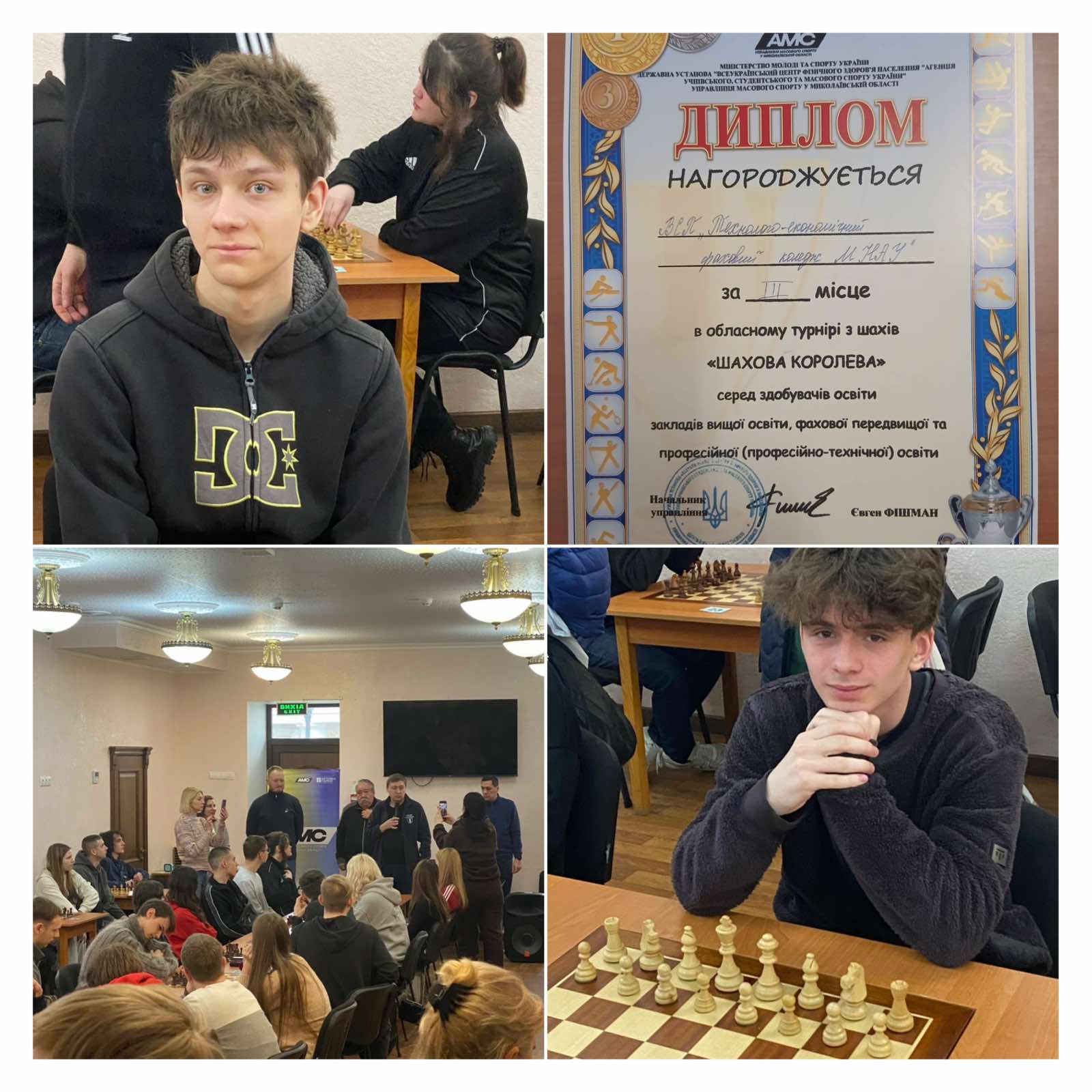 12 лютого 2026 року в Миколаївському обласному шаховому клубі відбувся обласний турнір з шахів «Шахова королева» серед здобувачів освіти закладів вищої освіти, фахової передвищої та професійної освіти. До складу команди ВСП “ТЕФК МНАУ” увійшли здобувачі – Торган Даніель, Гриценко Олександр ( гр. ІС 1/1 ) та Пєтков Максим ( гр. Е 2/1 ).